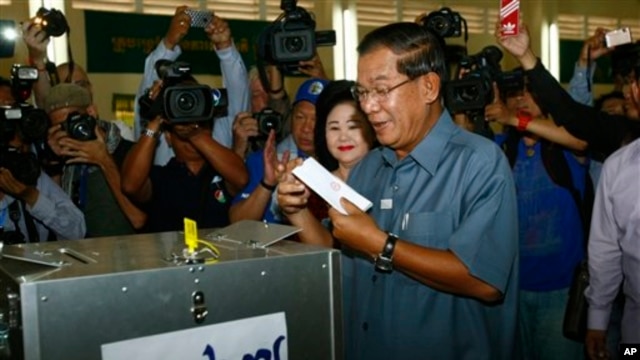 លោក នាយករដ្ឋមន្ត្រី ហ៊ុន សែន បោះសន្លឹកឆ្នោតនៅឯការិយាល័យមួយក្នុងក្រុងតាខ្មៅខេត្តកណ្តាល កាលពីថ្ងៃអាទិត្យទី ២៨ ខែកក្កដា ឆ្នាំ២០១៣។